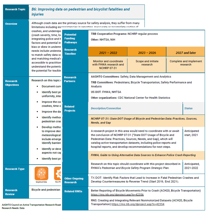 The Roadmap is designed to encourage active transportation research that will address the most important needs of state DOTs and similar transportation agencies. The research priorities in the Roadmap were developed through an extensive outreach effort as well as a focused review of existing research. Along with the Roadmap, the team developed a Continuity and Implementation Plan to provide the CAT with tools and mechanisms to implement the Roadmap with activities the CAT can undertake to further develop and advance the research needs identified and keep up on the ever-growing volume of research that will shape that effort.